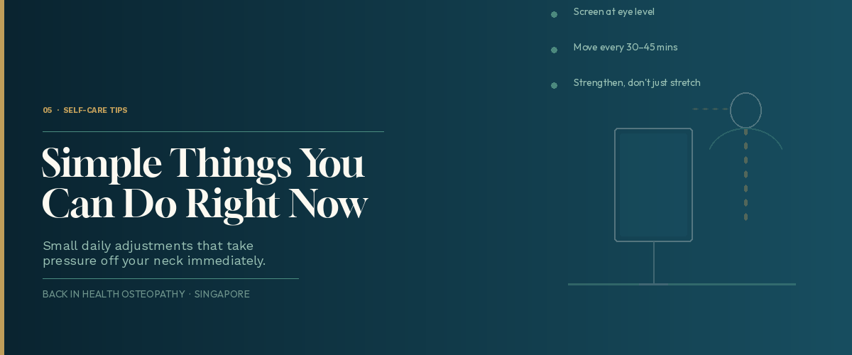 Strengthen, don't just stretch. Stretching provides temporary relief, but building strength in the deep neck flexors and the muscles between your shoulder blades gives your neck the structural support it needs to cope with the demands of desk work.