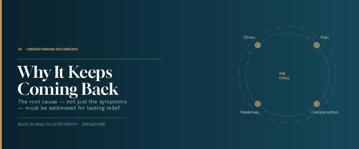 The underlying movement patterns and postural habits that caused the problem in the first place haven't changed. Without addressing the root cause — restricted joints, weakened deep neck flexors, poor thoracic mobility, or habitual forward head posture — symptom relief is only ever temporary.